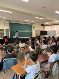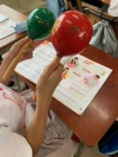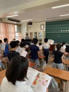 3年生以上の音楽は、音楽専科が受け持っています。授業の初めの時間は、常時活動ワークをしています。今日の4年生は、リズム打ちをしながら、繰り返し記号(リピート記号)を覚えました。理解したところで、「いろんな木の実」の歌をリピート記号に気をつけ歌いました。最後に歌と打楽器(今日はマラカスとクラベス)を合わせて練習しました。
