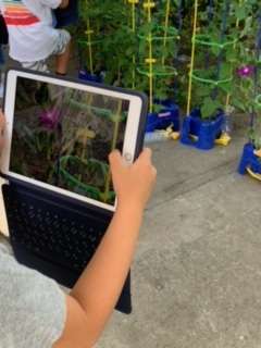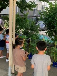 アサガオのお世話と観察をしている1年生です。「私のはきれいな水色のお花がさいたよ。」「僕のは紫色のお花だよ。」「私のはまだ。全然さかない。」「でも、つぼみがたくさんついているよ。」「これからたくさん咲くね。」などなど、次々に話しかけてくれる1年生でした。