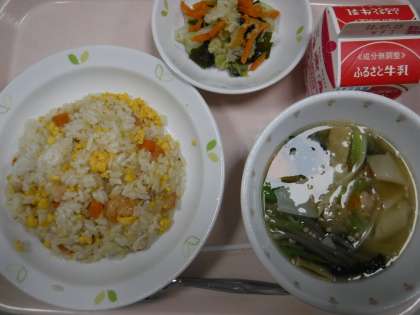 本日の献立 チャーハン 牛乳 わかめサラダ ワンタンスープ