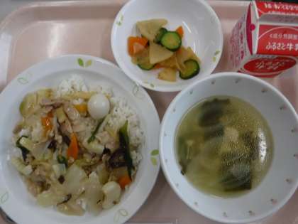 本日の献立 中華丼 牛乳 わかめスープ だいこんの中華味