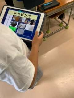 タブレットを活用して、1年生が「いろビンゴ」をしました。いろいろな色を見つけて写真に撮り、ロイロノートのビンゴカードに貼り付けていきました。タブレットの使い方にもずいぶんと慣れてきました。