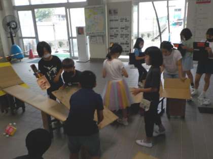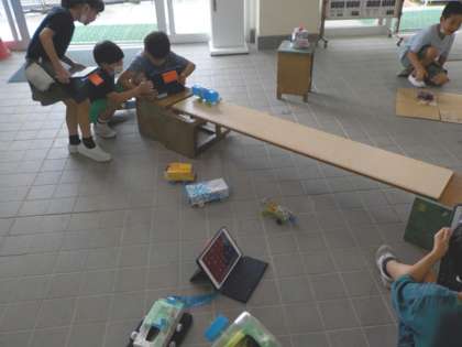 いくつかの図工いすと、板、段ボールを組み合わせて走るコースを自分たちでつくって走らせました。