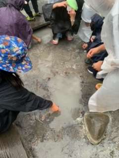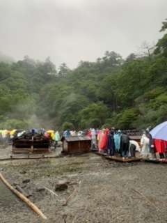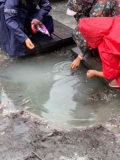 小雨の中、レインコートを着て源泉に向かいました。持ってきた10円玉や100円玉を入れて色が変わるか試しました。