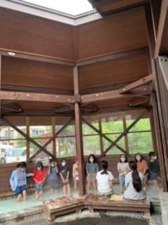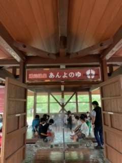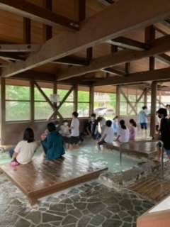 足湯を楽しみました。場所によって温度が違います。硫黄の香りがかすかに漂います。笑顔いっぱい「気持ちいい〜」の子どもたちの声です。