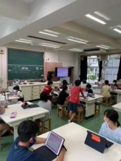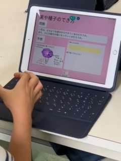 5年生の理科です。2学期初めの授業では、ヘチマやアサガオの花のつくりを予想しました。自分の考えを既習事項や生活経験からもち、その考えを発表し合いました。友達の考えは、タブレットを用いて共有し合いながら聞き合いました。