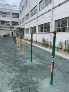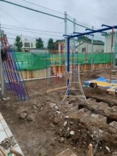 鉄棒や造形砂場は出来上がりました。今は、プール寄りに「ジャングルジム」「うんてい」「のぼりぼう」を設置中です。「うんてい」と「のぼりぼう」は、今回の改修で新しく設置されます。