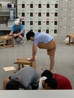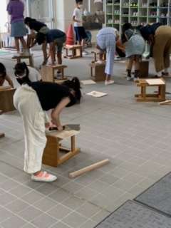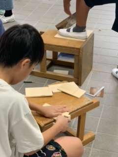 ノコギリの安全な使い方を学びました。「ギコトン動物園」をつくっていきます。今日は、つくりたい動物の形や動きを想像して、棒や板の切り方を考えました。