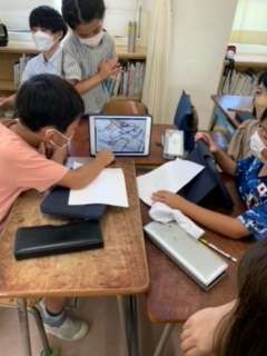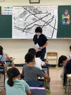 「まちたんけん 大はっけん」の学習会を進めています。今日は絵地図を見て、自分たちのまちにはさまざまな場所があることに気付き、これから行くまち探検への意欲を高めました。ロイロノートに送られてきた絵地図を見ながら、気付いたことや分かったことなどプリントにまとめ、友達と対話的に交流しました。
