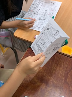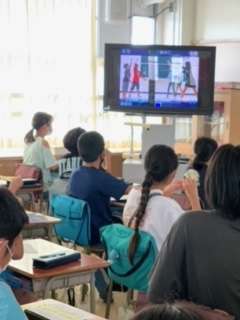 明日は「こまつなぎまつり」です。今年は4年生以上の学年が「お店」を出します。各お店は「紹介動画」をタブレットで撮影しました。左の写真はその動画を見ているところです。