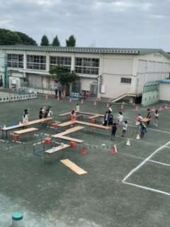 今日の午後に各お店が準備をしました。教室や体育館、校庭、特別教室などを使います。右の写真は、校庭のお店準備の様子です。