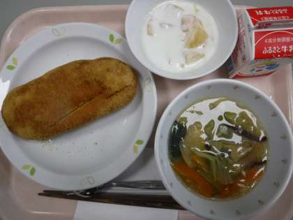 本日の献立 あげパン(きな粉) 牛乳 春雨スープ フルーツのヨーグルトかけ