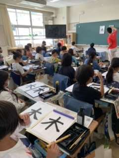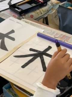 お手本をよく見て、始筆、終筆、はらいなどにに気を付け練習しました。筆の扱いにもずいぶんと慣れました。