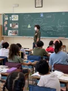 2年生の国語です。時間を表すことばに気をつけて読んでいます。筆者の仕事のそれぞれが何のためなのかを読み取りながら、自分の生活とも結びつけて考えました。それぞれの子どもたちが、ノートにいろいろな方法でまとめていました。