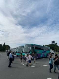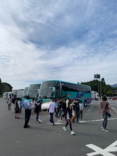 赤城高原SAでトイレ休憩を済ませました。気温は21度。少し肌寒いですが、みな元気いっぱいです。バスの中ではそれぞれのクラスが感染症防止対策も考えたバスレクをしています。
