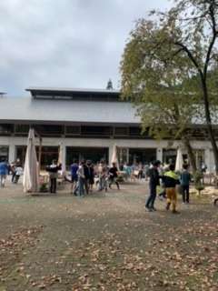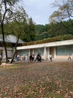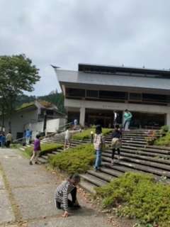 入室まで時間があるので、集合写真を撮った後に、宿舎前のお祭り広場で、自然を楽しみながら過ごしています。友達との仲を深める子どもたちです。
