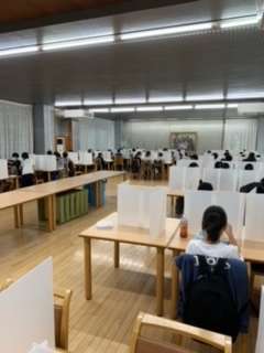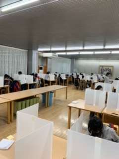 食堂の様子です。感染症予防対策のために、パーティションをしています。