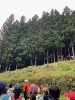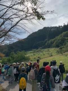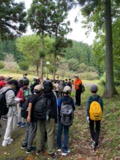 「川場の里山入門」の活動をしています。二つのグループに分かれて、案内の方から説明を聞きながら、宿舎周りを歩いています。記録担当の子どもは、iPadで撮影しています