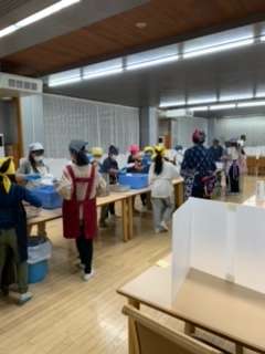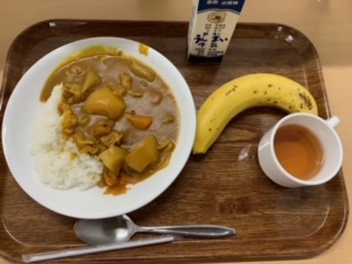 夕飯です。丸太を切って力を使い、お腹が空きました。お代わりをする子がたくさんいます。感染症予防のために「いただきます」の前に、ご飯とカレールーを