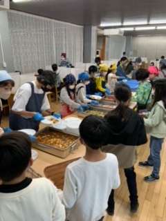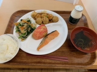 朝食を美味しくいただきました。食事係が手際よく盛り付けました。