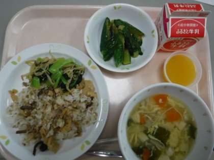 本日の献立 ビビンバ 牛乳 きゅうりのみそソテー わかめスープ みかんゼリー