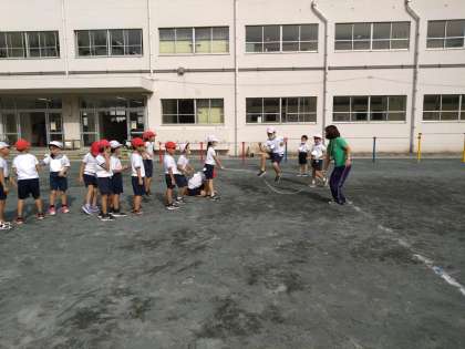 回し手の児童は担任と息がぴったり。跳んでいる児童も、1年生の時より張り切って跳べています。