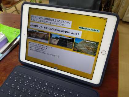 ロイロノートの生徒発表機能を使うと、全員のiPadに同じ画面が配信されます。