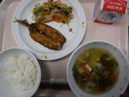 本日の献立 ごはん 牛乳 魚のかばやき風 野菜のおかかかけ すまし汁