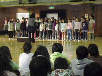 12月21日(水)に,2学期最後の音楽集会がありました。今月は合唱団の児童が発表しました。朝のひんやりと引き締まる空気の中,発表曲「瑠璃色の地球」のハーモニーのすばらしさに全校児童が聴き入っていました。