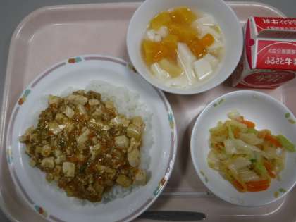 本日の献立 麻婆豆腐丼 牛乳 中華サラダ 杏仁豆腐