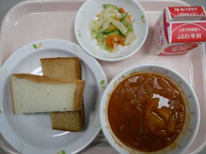 本日の献立 二色サンド 牛乳 トマトシチュー 野菜のレモンサラダ