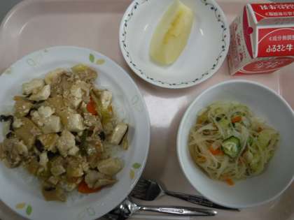 本日の献立 家常豆腐丼 牛乳 春雨サラダ りんご