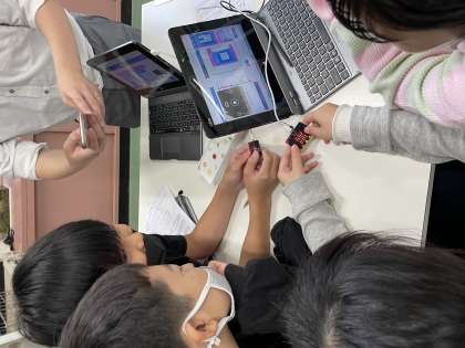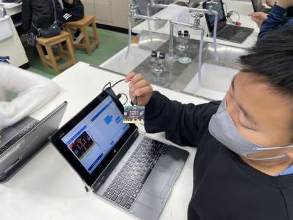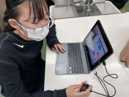 他にも、micro:bitを傾けると音がなるやmicro:bitのボタンを押すと気温を表示するなど自分たちで発展的なプログラミングにも進んで取り組みました。
