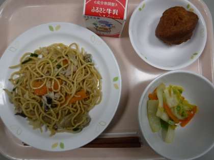 本日の献立 塩焼きそば 牛乳 野菜の中華かけ サーターアンダーギー