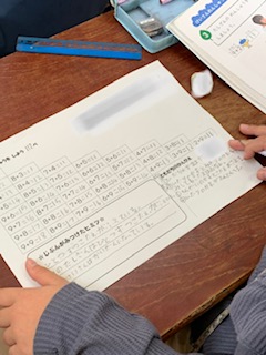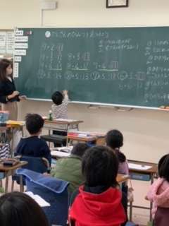 1年生算数です。答えが同じになるたしざんを並べて、きまりを見つけました。並んだ表を縦、横、ななめと多面的に見てきまりを見つけようと意欲的に取り組んでいました。