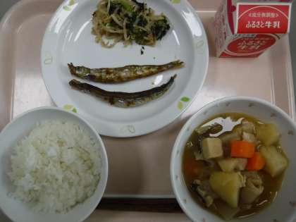 本日の献立 ごはん 牛乳 ししゃものカレー揚げ こまつなの乾物あえ