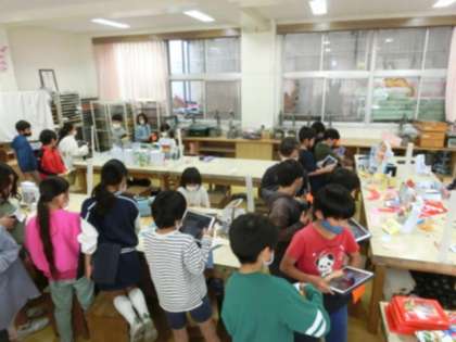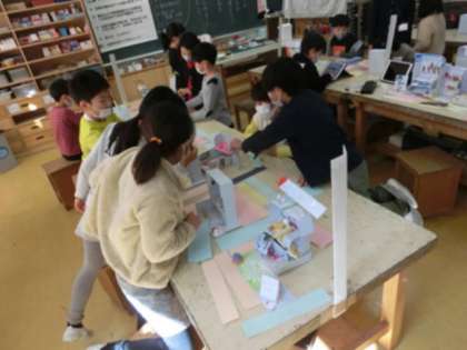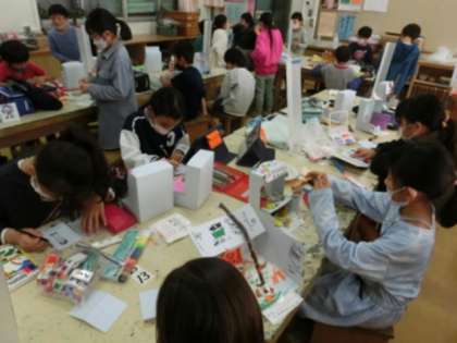 お店づくりも仕上がり、お互いのお店を並べて商店街をつくり鑑賞しあう造形活動です。