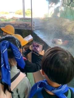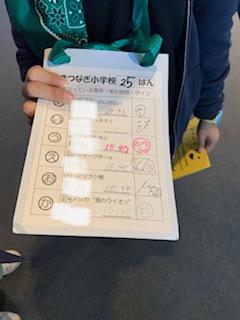 スタンプラリー、コンプリート!嬉しそうにカードを見せにきてくれました。完成したあとはお気に入りのところをじっくり見学。発見したことを会話しながら見学している子どもたちです。グループに一台のタブレットを使い、写真や動画も撮りました。学校で、作文や図工に生かします。