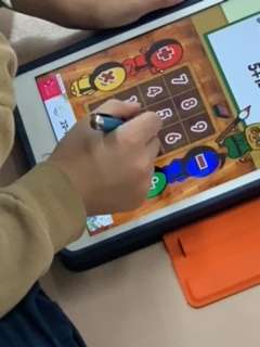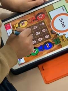 課題が終わってしまった隙間時間などに、タブレットにある計算問題などに取り組む1年生です。