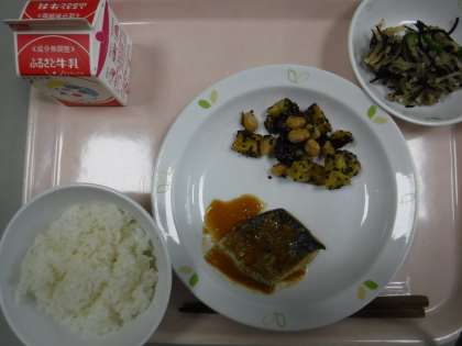 本日の献立 ごはん 牛乳 魚のピリ辛ソースかけ 大根とひじきのおかかあえ