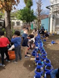 2年生は、自分の鉢にチューリップの球根を植えました。寒い冬を越して春にどんな花がさくかな?楽しみにしながら植えました。