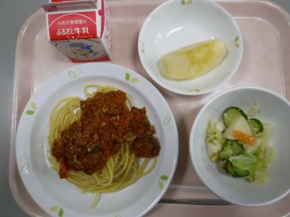 本日の献立 スパゲッティミートソース 牛乳 ポテト入りフレンチサラダ りんご