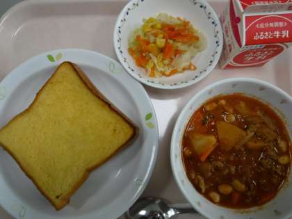 本日の献立 フレンチトースト 牛乳 ポークビーンズ コーンサラダ