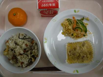本日の献立 ひじきごはん 牛乳 切り干し大根の卵焼き もやしのコチュジャンかけ