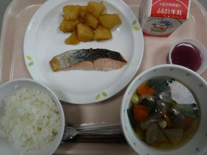 本日の献立 ごはん 牛乳 魚の塩焼き じゃがいもの甘辛煮 根菜汁 ぶどうゼリー