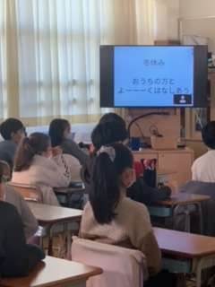 全校朝会をしました。校長からは、土曜日のなわとびコンクールを通して培った「諦めない心」と「友達と励まし合う思いやりの心」の話、看護当番の教員から生活目標の話、ICT担当者からは、iPadの扱い方や冬休みを迎えるに当たって、その使い方や時間について家の人とよくよく話し合いをすることの話がされました。