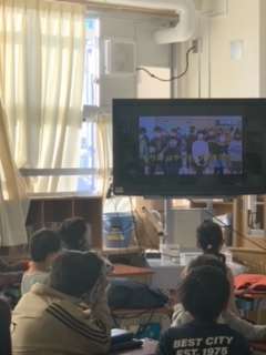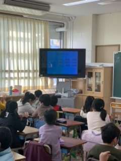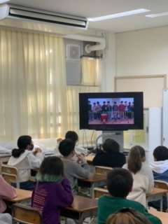 今月の音楽集会では、4年生が音楽の時間に撮影した12月の歌が披露されました。明るく楽しく歌う4年生の歌声に合わせて、各学級でも歌いました。