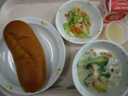 本日の献立 黒砂糖パン 牛乳 さつま芋シチュー キャベツサラダ りんごゼリー