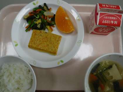本日の献立 ごはん 牛乳 卵焼き 白菜ののりあえ 吉野汁 夢オレンジ