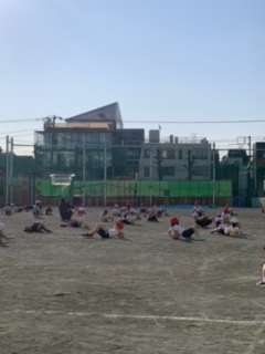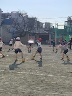 2年生の外体育では、ボールけりゲームをします。今日はボールに慣れるために、ボールを蹴ったり止めたり等、ボールを使った様々な動きをしました。