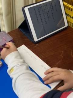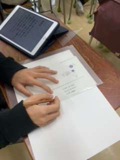 6年生の国語で、詩をつくりました。効果的に伝わるように、比喩、繰り返し、リズム、倒置法等様々な表現の工夫を学び、自分の作品づくりに生かしています。タブレットで下書きをして、画用紙に清書しました。